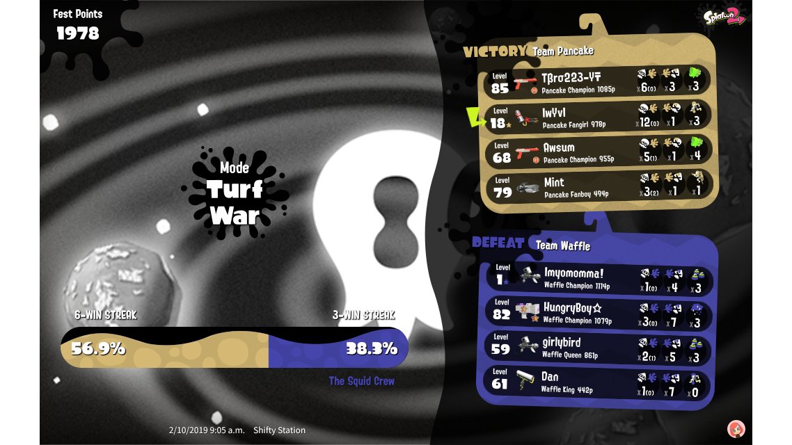 | Splatfest Title | Pancake Fangirl 20 → Pancake Fiend 0 | |||||||||||||||||||||||||||||||