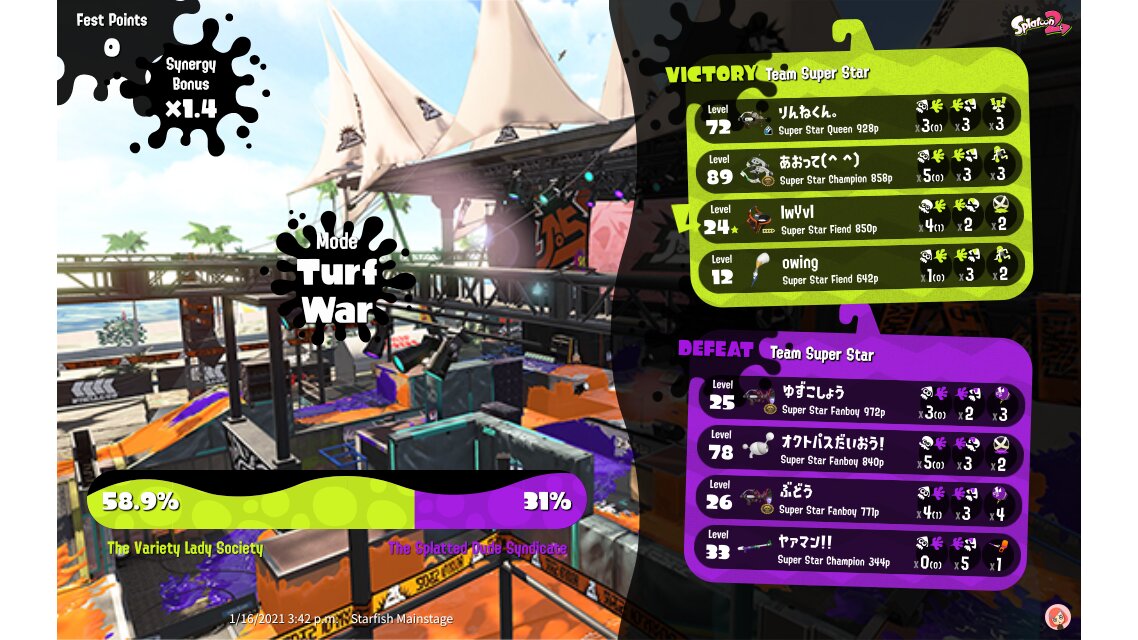 | Splatfest Title | Super Star Fiend 218 → Super Star Defender 52 | |||||||||||||||||||||||||||||||||||||