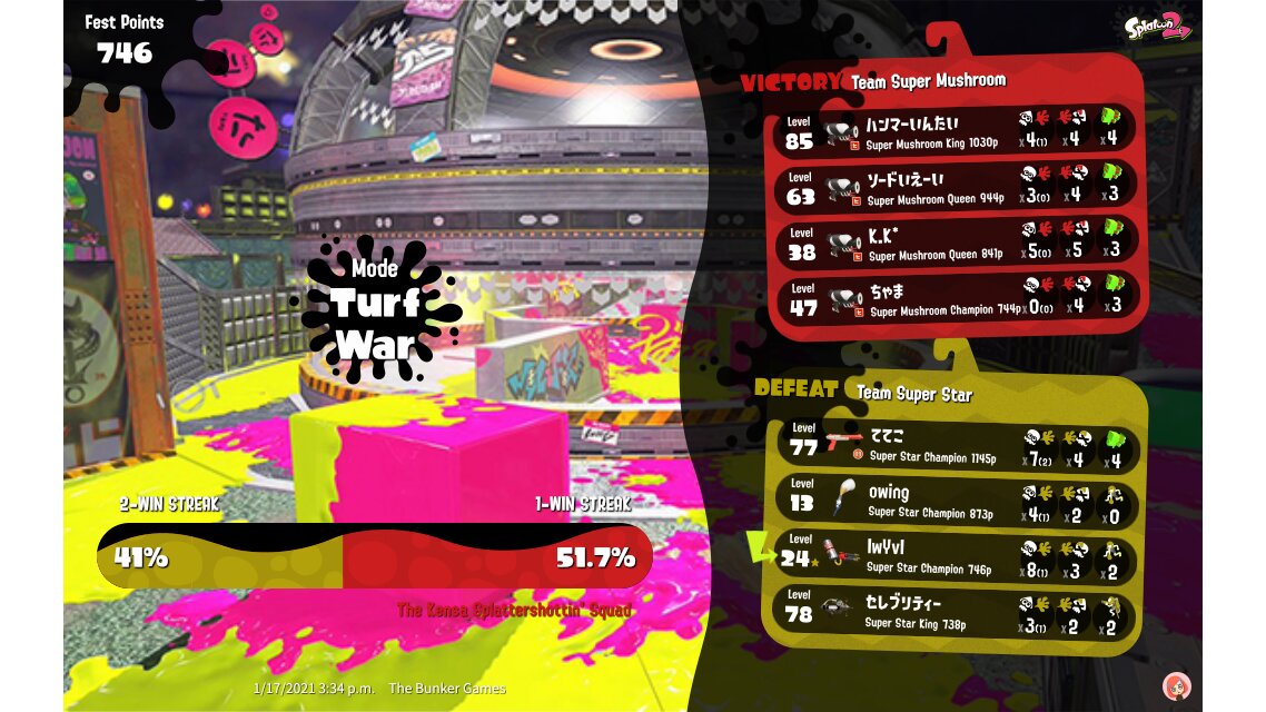 | Team Super Mushroom The Kensa Splattershottin' Squad Win Streak: 1 | 3,559 | 11 / 17 | 0.65 39.29% | ||||