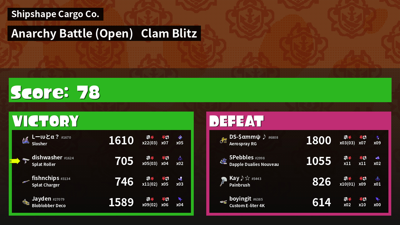 | Mode | Clam Blitz - Anarchy Battle (Open) | ||