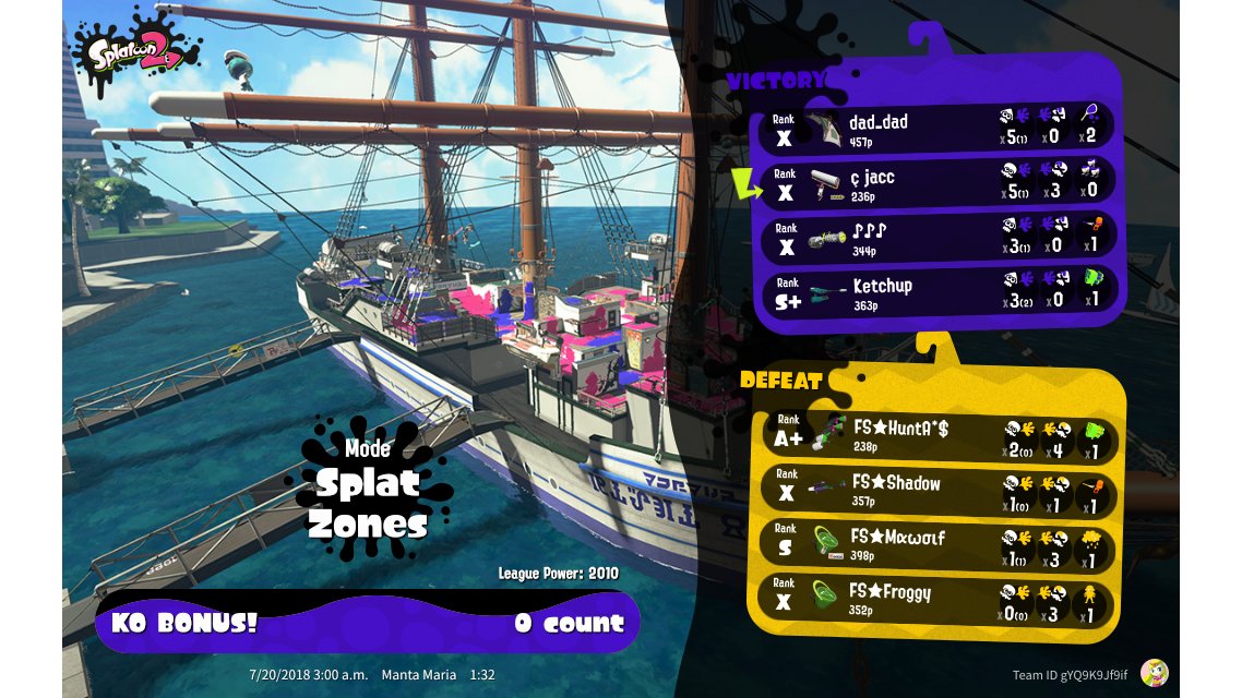 | Mode | Splat Zones - League Battle (Quad) | ||||||||||||||||||||||||||||||||||