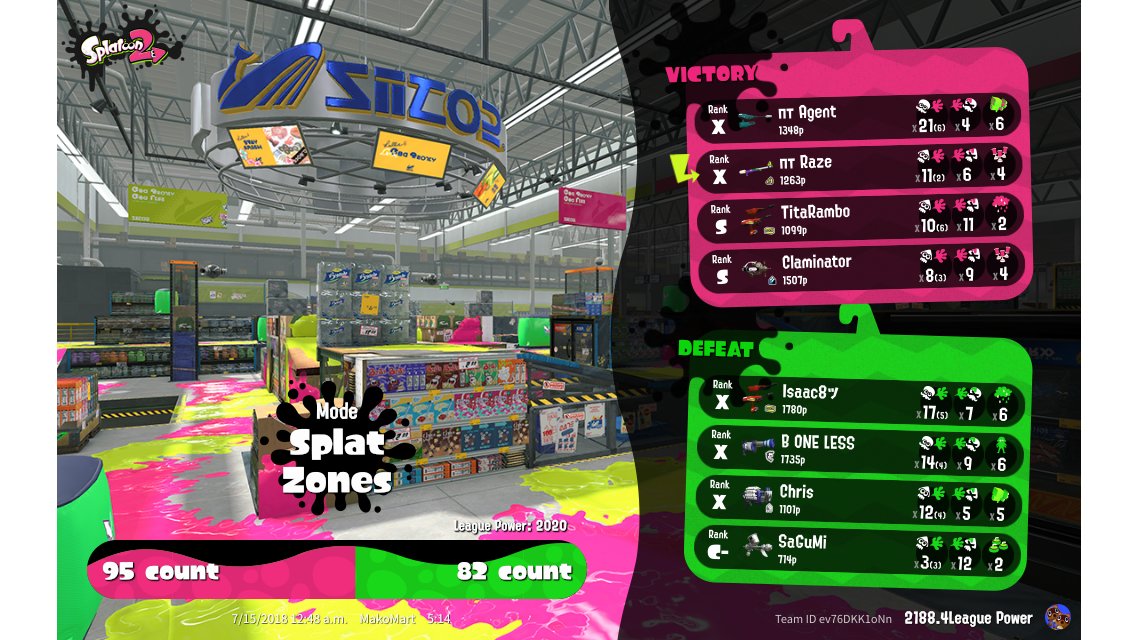 | Mode | Splat Zones - League Battle (Twin) | ||||||||||||||||||||||||||||||||||