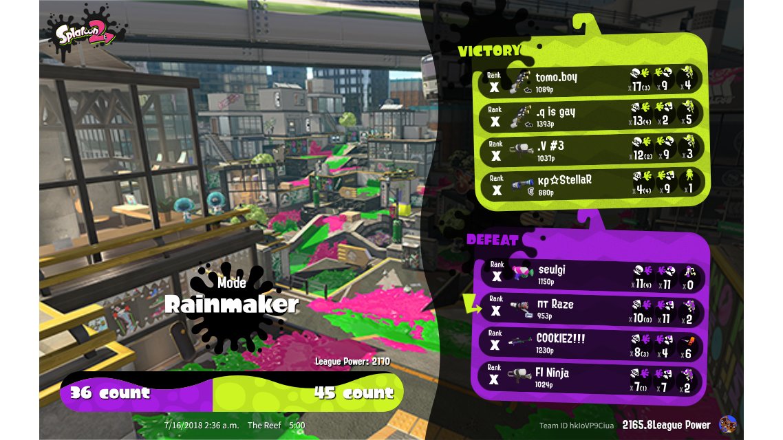| Mode | Rainmaker - League Battle (Twin) | |||||||||||||||||||||||||||||||