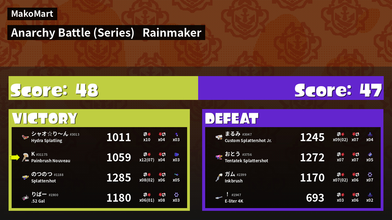 | Medals | #1 Overall Splatter #1 Splat Assister #1 Ground Traveler | ||