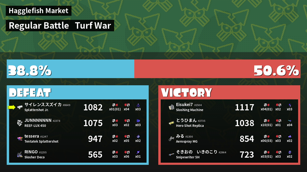 | Medals | #1 Turf Inker #1 Splat Assister #1 Big Bubbler User | ||