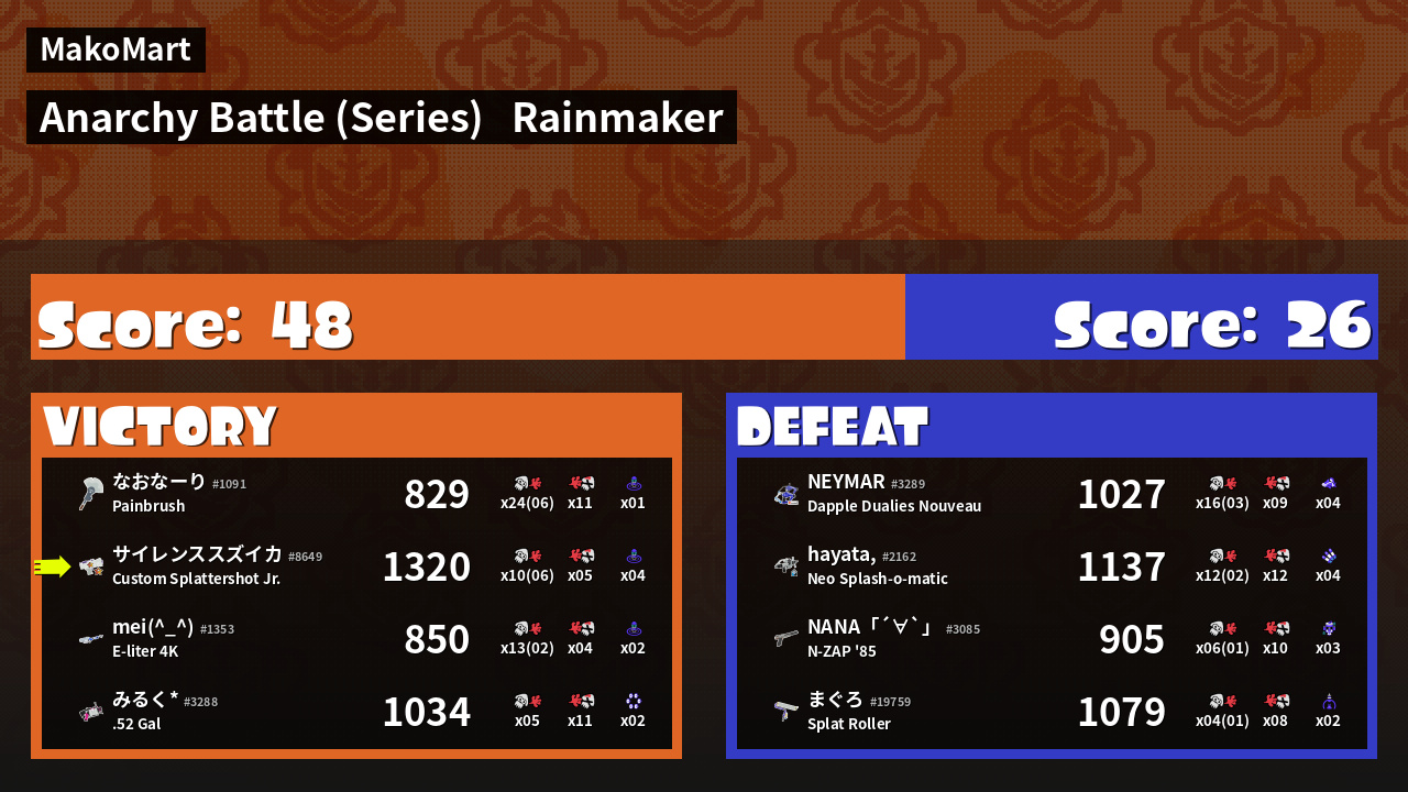 | えいえんのバイトリーダー サイレンススズイカ #8649 |  Custom Splattershot Jr.                    | 1,320 | 4 + 6 | 5 | 0.80 |  4 | |