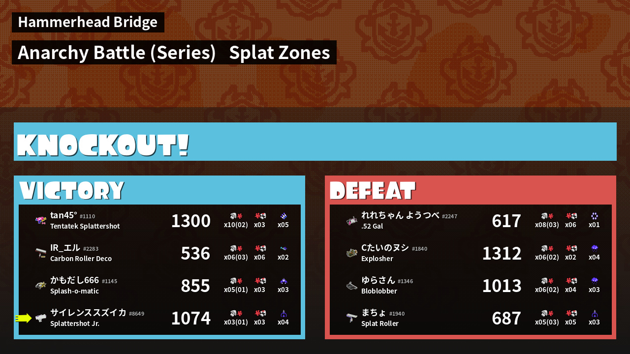 | Medals | #1 Popular Target #1 Splat Zone Hero #1 Damage Taker | ||