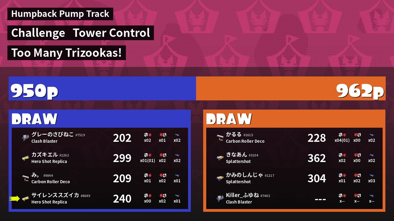 | 配信終わりのクラゲ かみのしんじゃ #1217 |  Splattershot                    | 304 | 1 + 0 | 2 | 0.50 |  3 | |