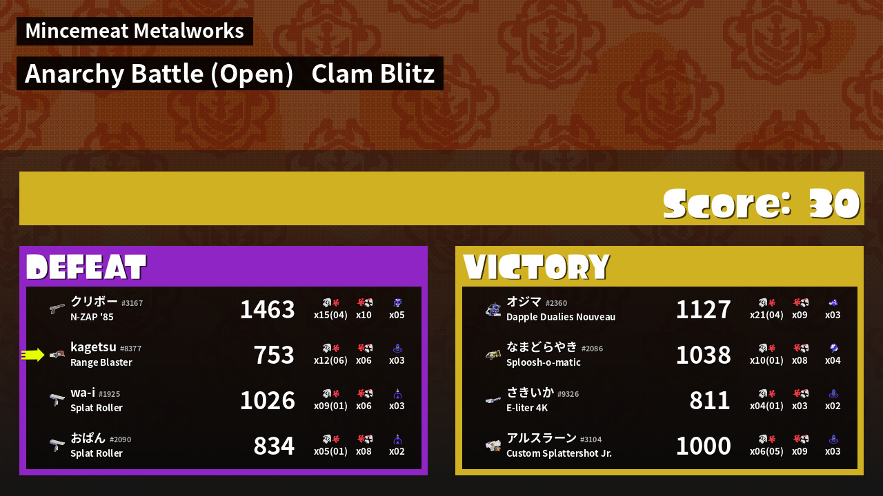 | Medals | #1 Clam Carrier #1 Splat Assister #1 Damage Taker | ||
