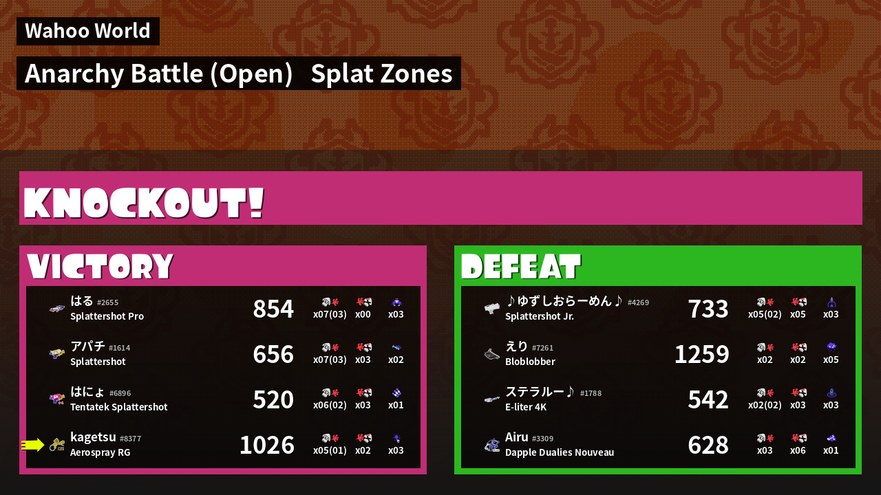 | 大大吉のナイス はる #2655 |  Splattershot Pro                    | 854 | 4 + 3 | 0 | 99.99 |  3 | |