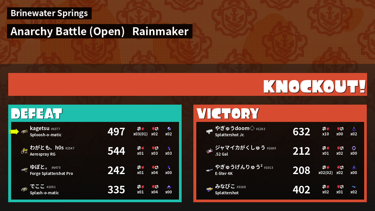 | 激レアの天然記念物 みなぴこ #3188 |  Splattershot                    | 402 | 2 + 0 | 1 | 2.00 |  2 | |