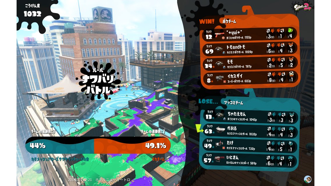 | Team ツッコミ カモメッシュアローズタタキベッチューイカ会 Win Streak: 7 | 3,378 | 14 / 16 | 0.88 46.67% | ||||