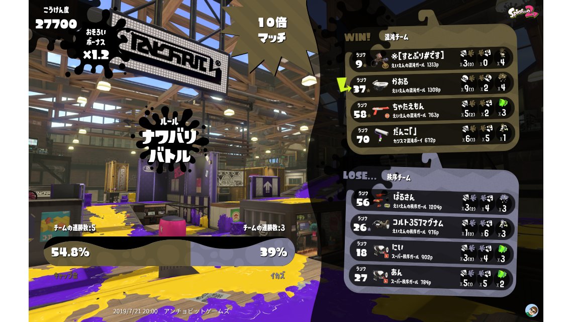 | Team 秩序 イカズ Win Streak: 3 | 3,866 | 9 / 19 | 0.47 32.14% | ||||