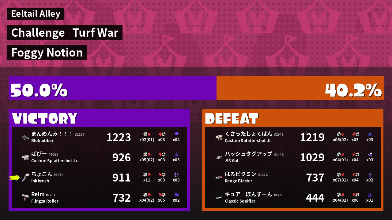 | Medals | #1 Overall Splatter #1 Popular Target #1 Enemy-Base Inker | ||