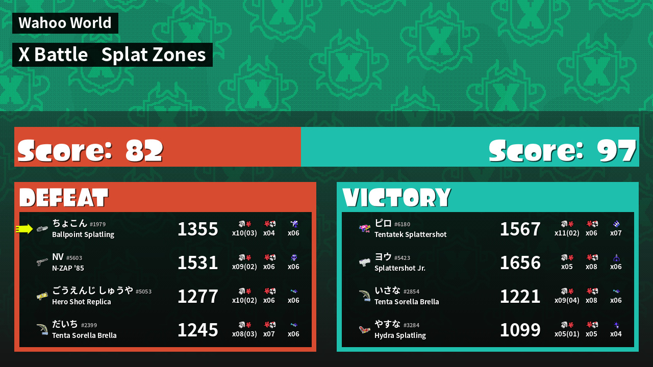 | Medals | #1 Overall Splatter #1 Splat Zone Guard #1 Super Jump Spot | ||
