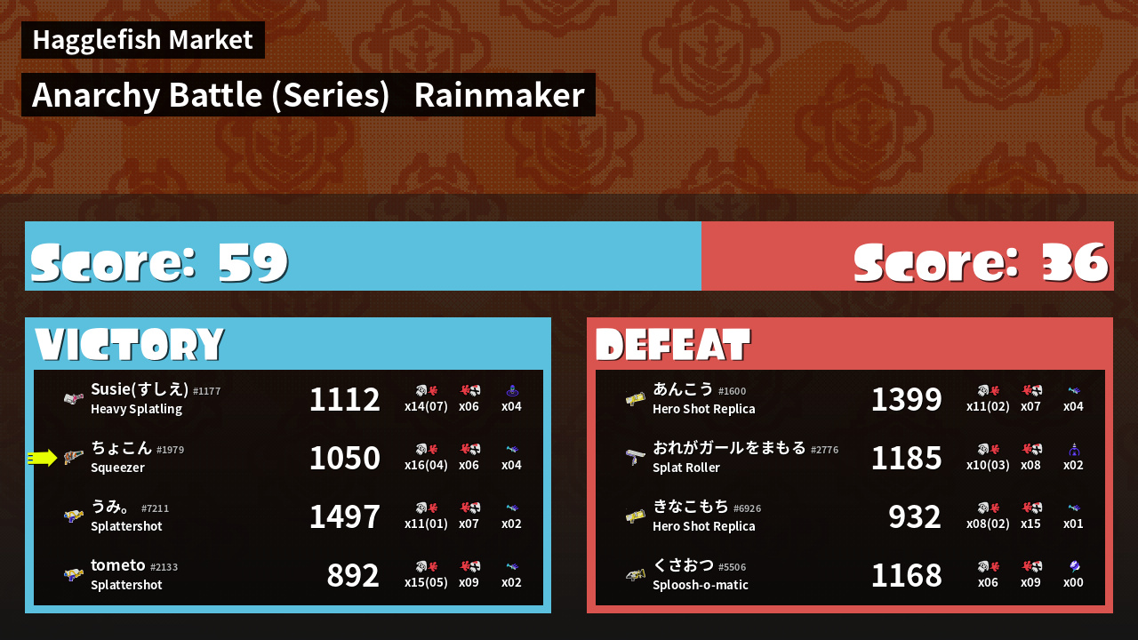 | Medals | #1 Overall Splatter #1 Enemy Splatter #1 Rainmaker Stopper | ||