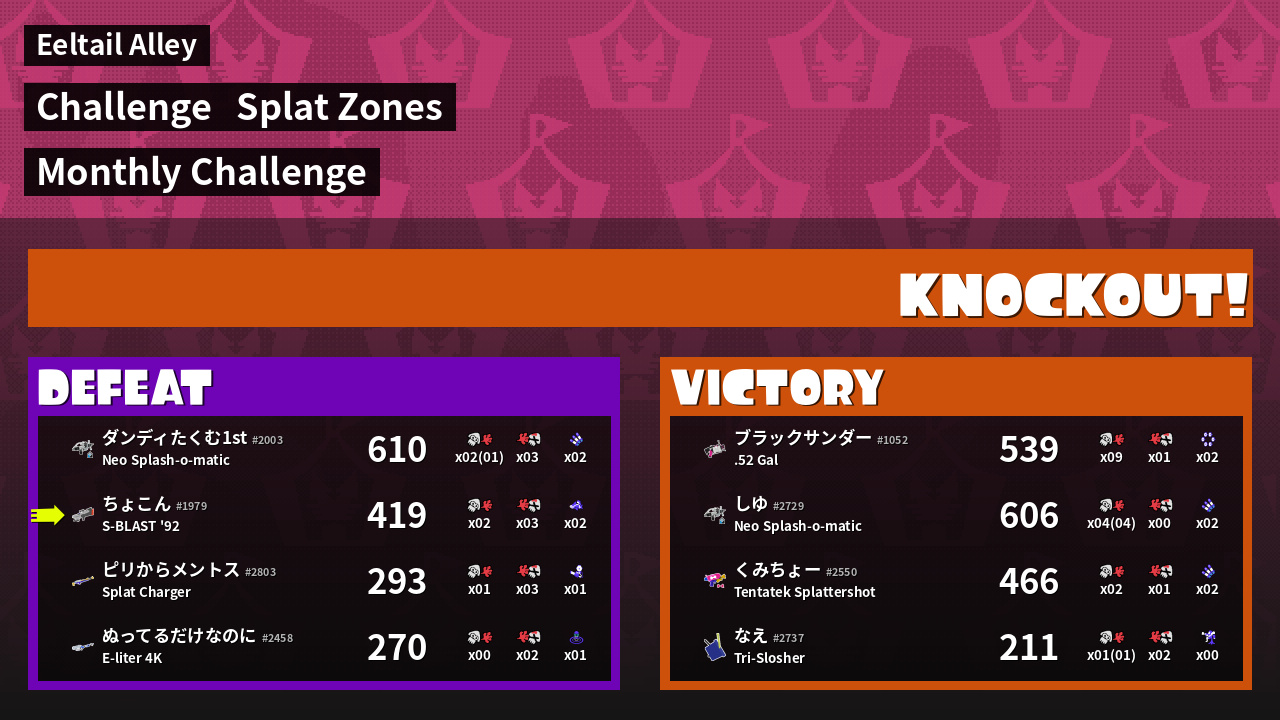 | Medals | #1 Overall Splatter #1 Popular Target #1 Enemy Splatter | ||