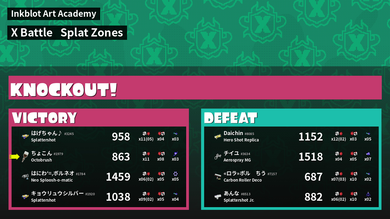 | Medals | #1 Overall Splatter #1 Splat Zone Guard #1 Enemy Splatter | ||