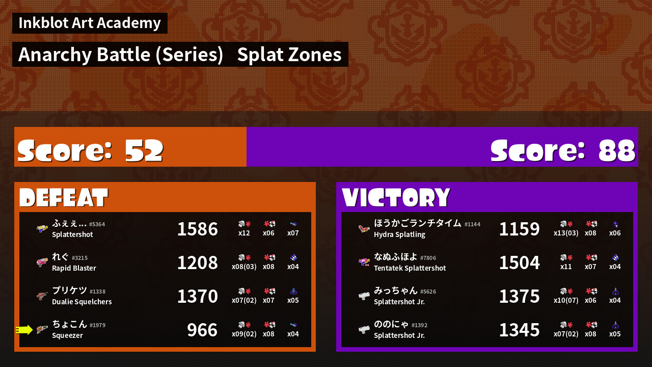 | Medals | #1 Splat Zone Hero #1 Damage Taker #2 Overall Splatter | ||