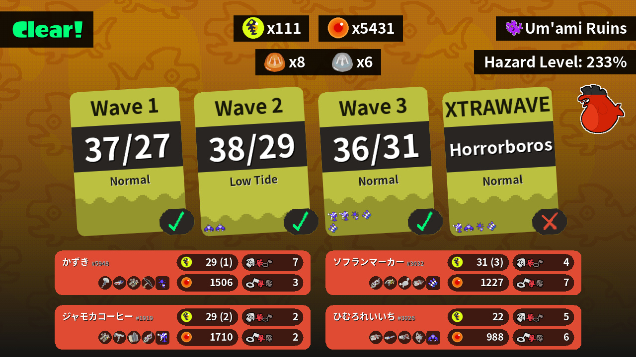 | Weapons | Painbrush Splattershot Pro Grizzco Dualies Undercover Brella | Dark Tetra Dualies Splash-o-matic Luna Blaster Heavy Edit Splatling | Grizzco Dualies Dynamo Roller Sloshing Machine Dark Tetra Dualies | Heavy Edit Splatling E-liter 4K Blaster Tri-Stringer |