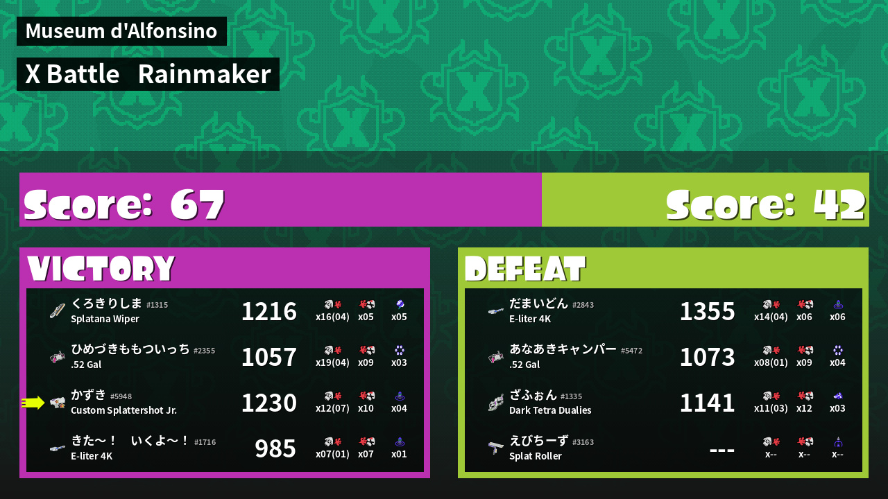 | Medals | #1 Turf Inker #1 Splat Assister #1 Rainmaker Stopper | ||