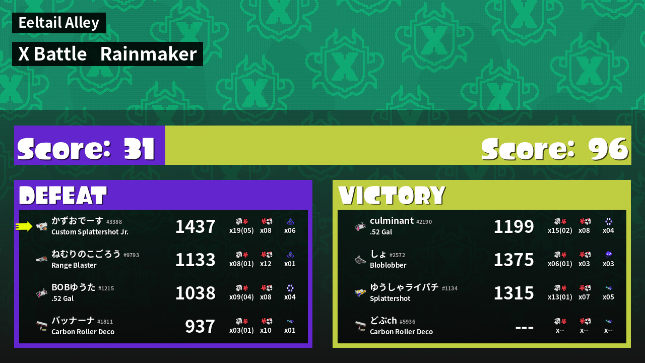 | Medals | #1 Overall Splatter #1 Turf Inker #1 Enemy Splatter | ||