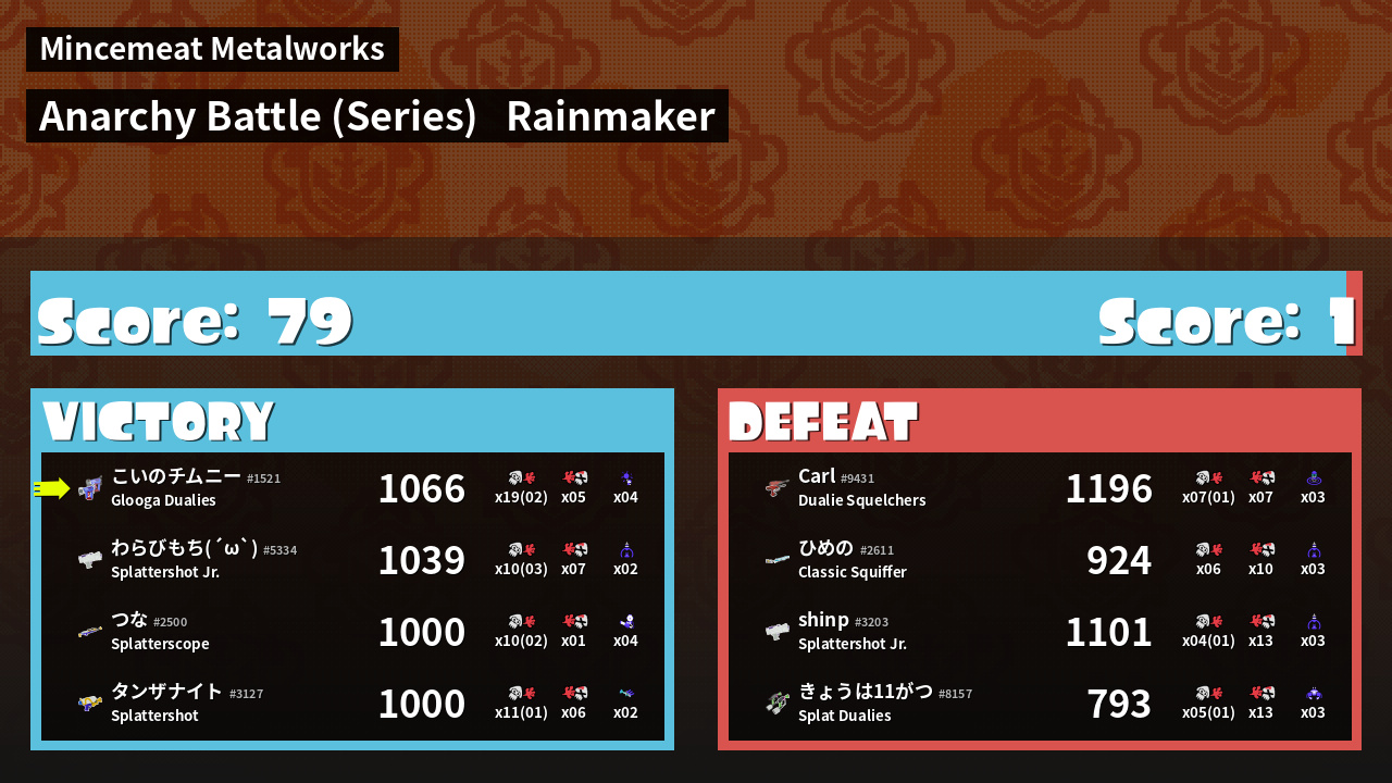 | Medals | #1 Overall Splatter #1 Turf Inker #1 Enemy Splatter | ||