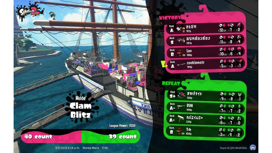 | Mode | Clam Blitz - League Battle (Twin) | ||||||||||||||||||||||||||||||||||||||||
