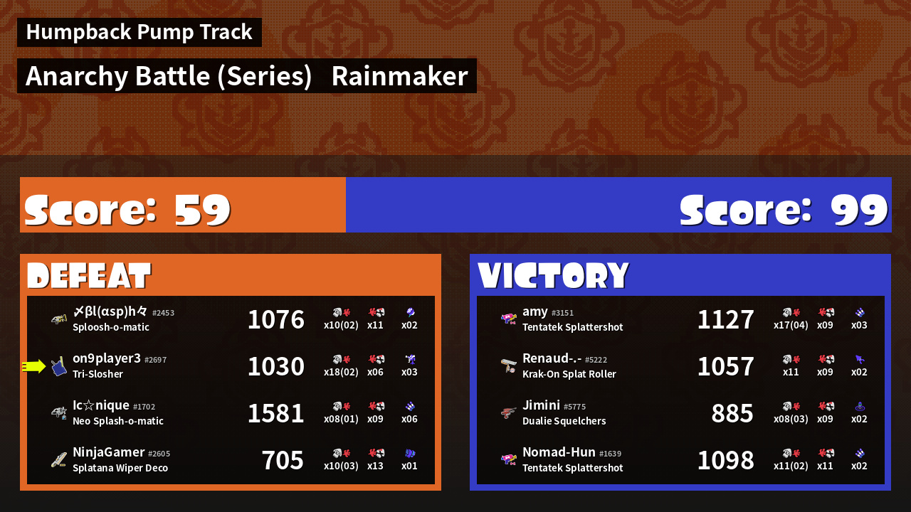 | Medals | #1 Overall Splatter #1 Enemy Splatter #1 Rainmaker Stopper | ||