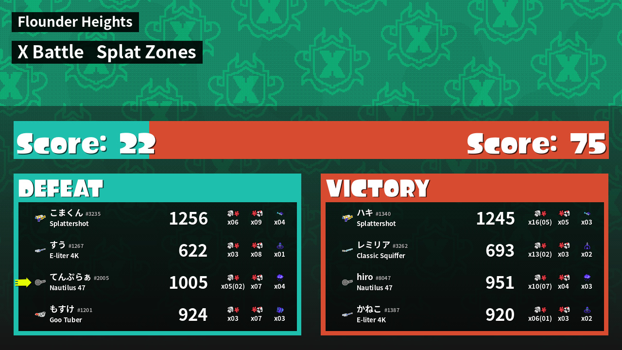 | Self-Identified Splat Bomber こまくん #3235 |  Splattershot                    | C- | 1,256 | 6 + 0 | 9 | 0.67 |  4 | |