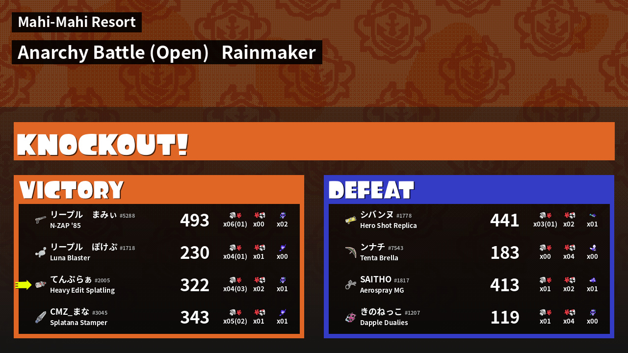 | Scorching Tempura  てんぷらぁ #2005 |  Heavy Edit Splatling                    | 322 | 1 + 3 | 2 | 0.50 |  1 | |