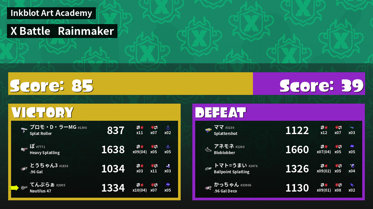| Medals | #1 Splat Assister #1 Ink Storm User #2 Overall Splatter | ||