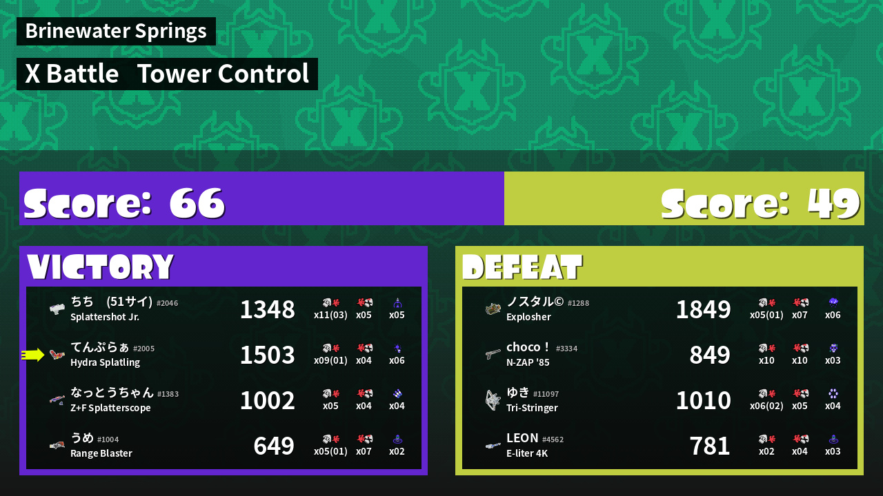 | Medals | #1 Score Booster #1 Turf Inker #1 Enemy Splatter | ||