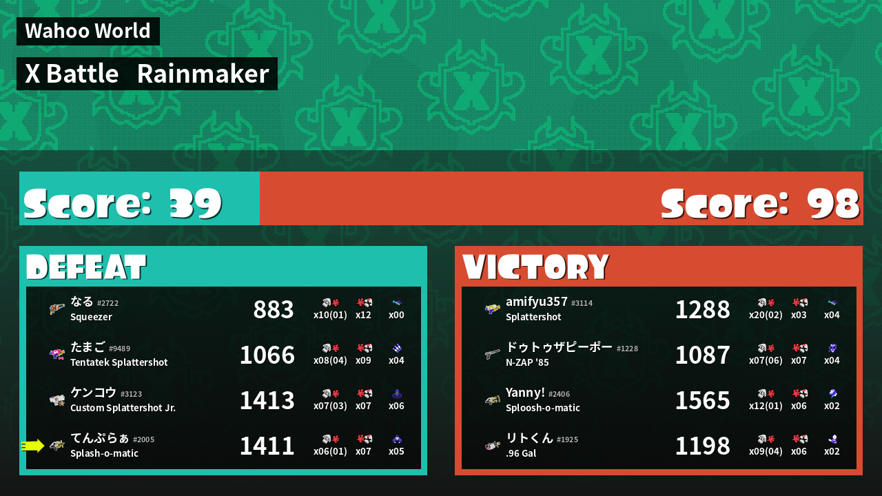 | Splatlandian Youth ケンコウ #3123 |  Custom Splattershot Jr.                    | C- | 1,413 | 4 + 3 | 7 | 0.57 |  6 | |