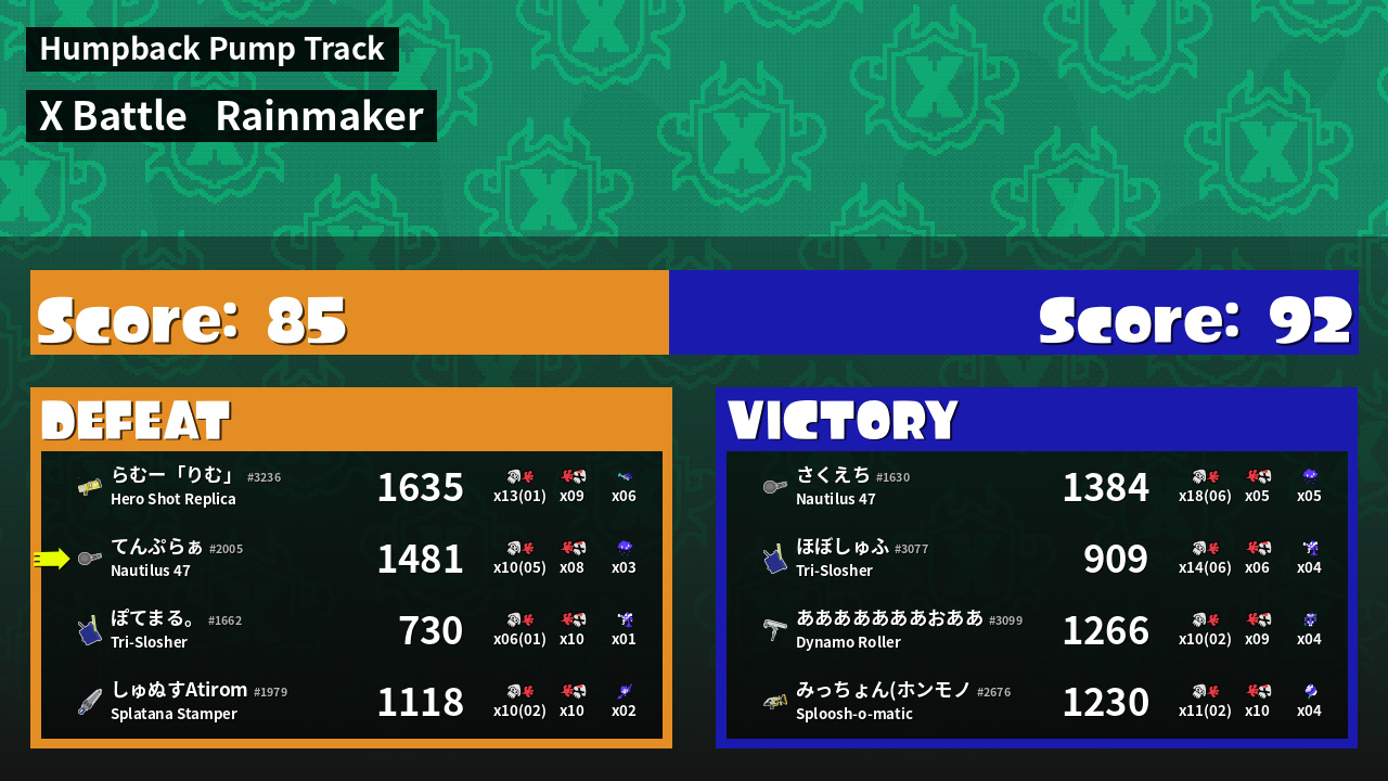| Medals | #1 Splat Assister #1 Rainmaker Stopper #1 Damage Taker | ||