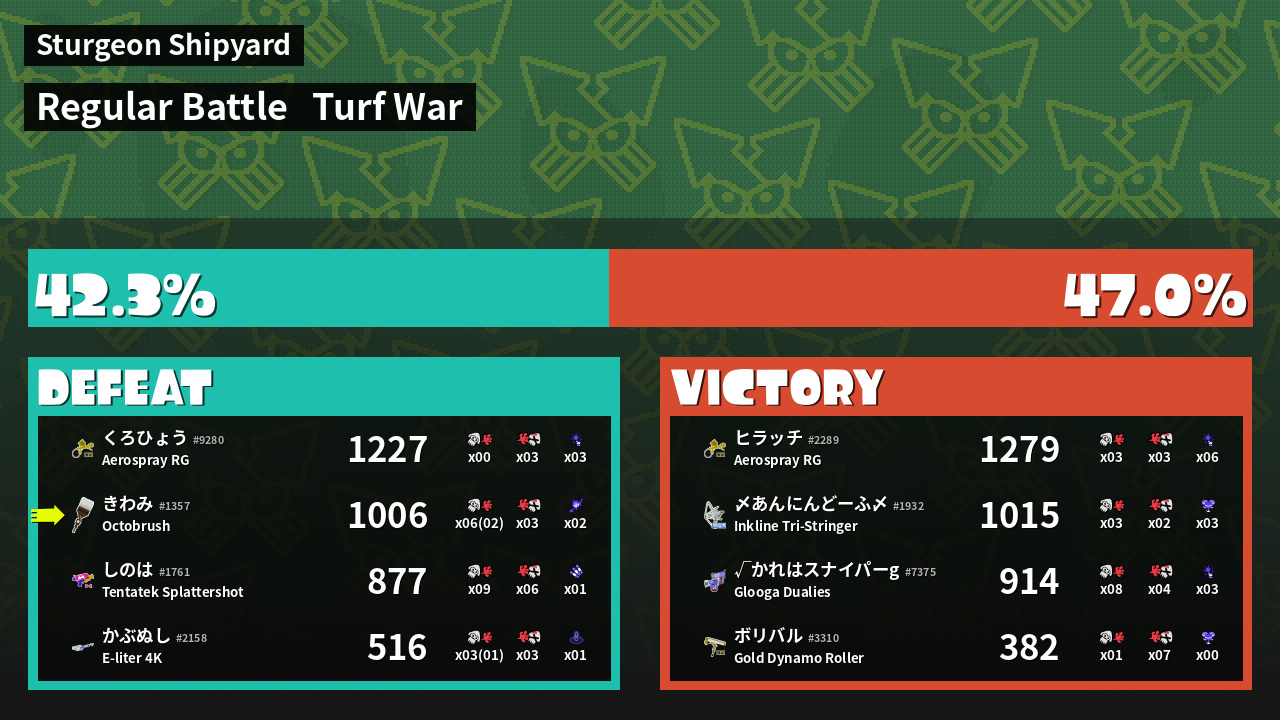 | Medals | #1 Enemy-Base Inker #1 Super Jump Spot #1 Splat Assister | ||