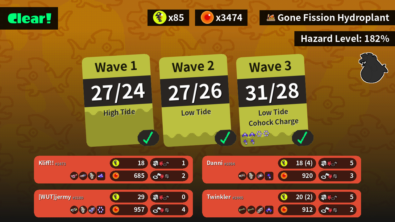 | Weapons | Rapid Blaster Pro Splattershot Pro Grizzco Stringer | Splattershot Nova Grizzco Stringer Glooga Dualies | Bamboozler 14 Mk I Bamboozler 14 Mk I Dark Tetra Dualies | Range Blaster Grizzco Stringer .52 Gal |