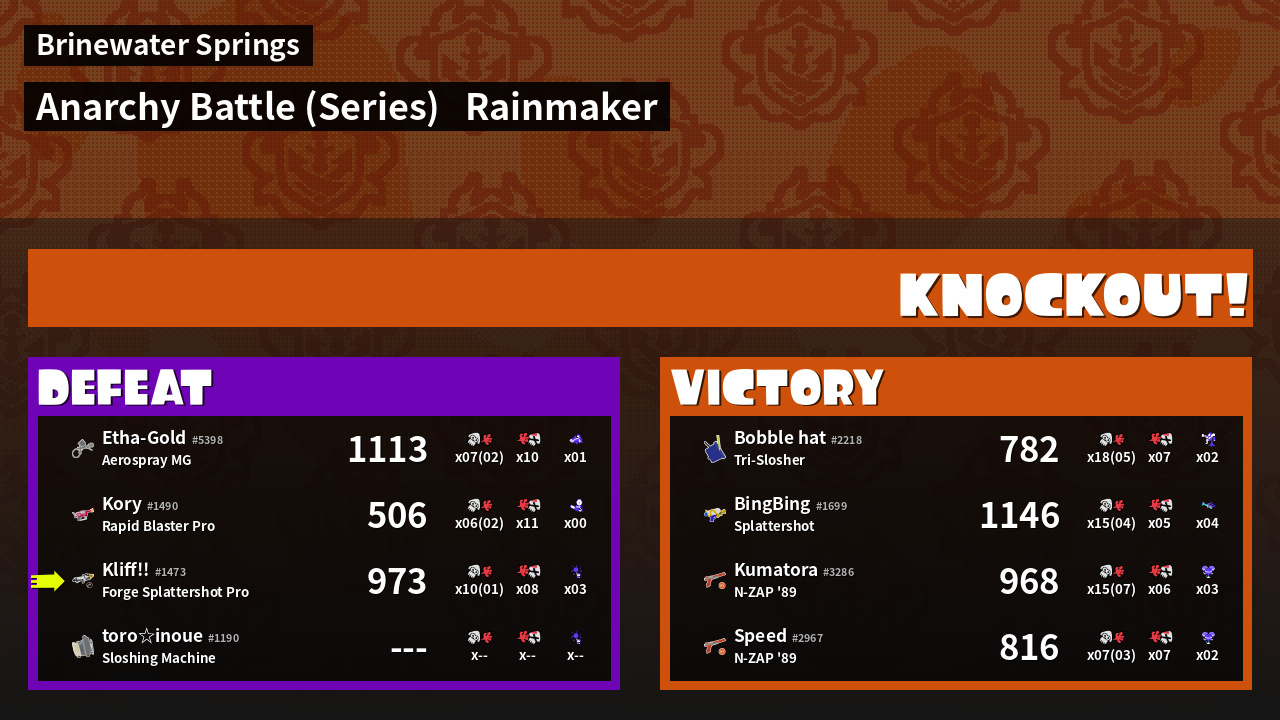 | Medals | #1 Overall Splatter #1 Enemy Splatter #1 Rainmaker Stopper | ||