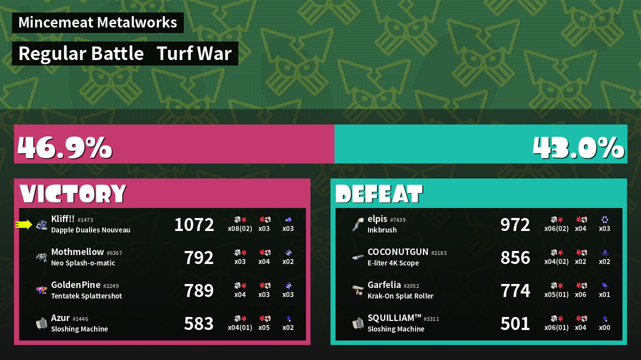 | Medals | #1 Overall Splatter #1 Turf Inker #1 Enemy-Base Inker | ||
