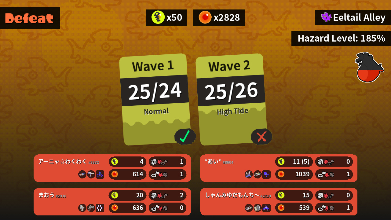| Weapons | Splattershot Pro Splat Roller | Grizzco Stringer Aerospray MG | .96 Gal Sloshing Machine | Slosher Grizzco Brella |