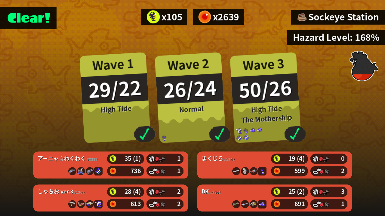 | Weapons | H-3 Nozzlenose Slosher L-3 Nozzlenose | Carbon Roller Hydra Splatling Splattershot | Bamboozler 14 Mk I E-liter 4K Splash-o-matic | Classic Squiffer Grizzco Stringer Splattershot Pro |