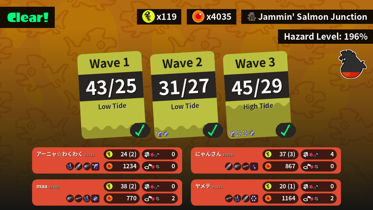 | Weapons | Tri-Slosher Splatana Stamper H-3 Nozzlenose | H-3 Nozzlenose Snipewriter 5H Tri-Slosher | Splatana Stamper H-3 Nozzlenose Snipewriter 5H | Snipewriter 5H Tri-Slosher Splatana Stamper |