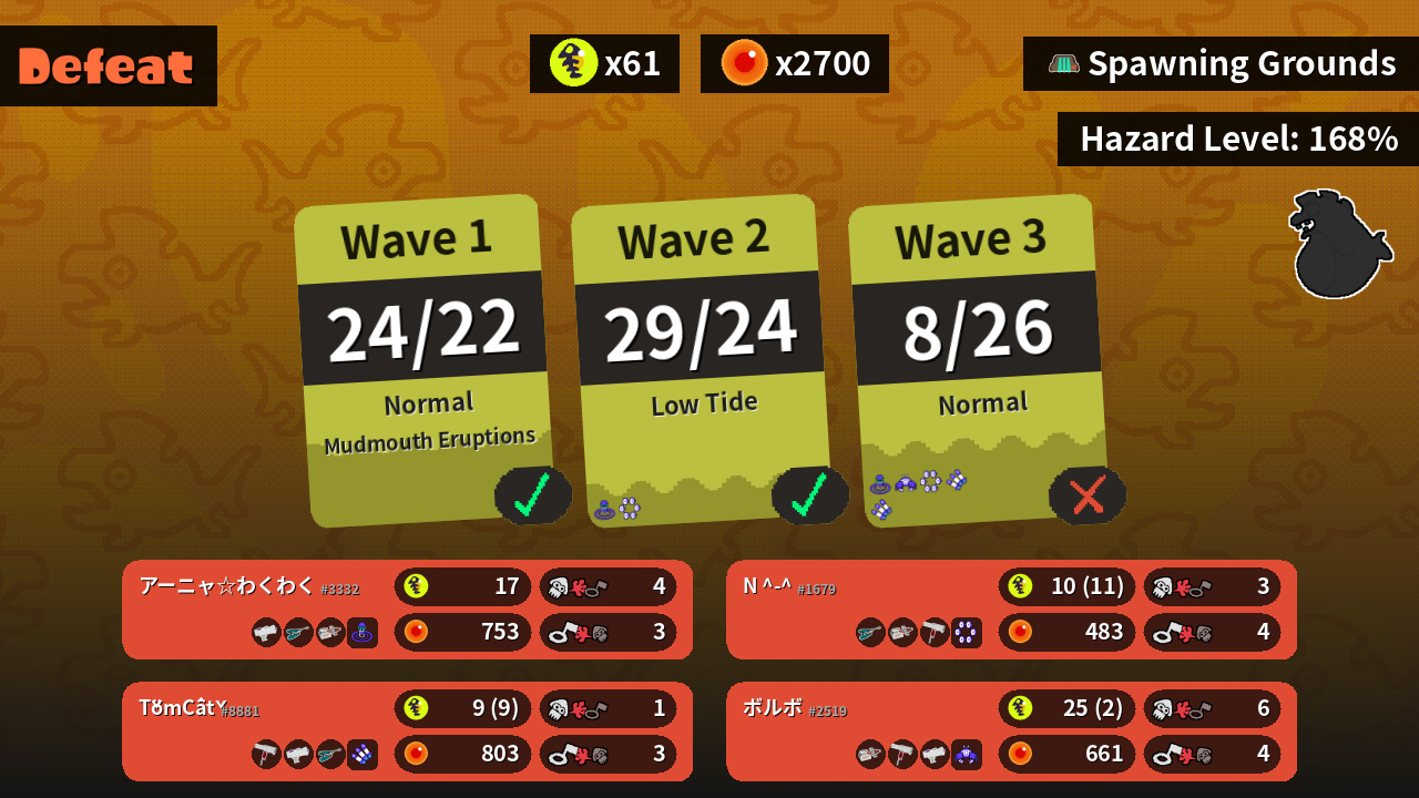 | Weapons | Splattershot Jr. Jet Squelcher Heavy Edit Splatling | Heavy Edit Splatling Flingza Roller Splattershot Jr. | Jet Squelcher Heavy Edit Splatling Flingza Roller | Flingza Roller Splattershot Jr. Jet Squelcher |
