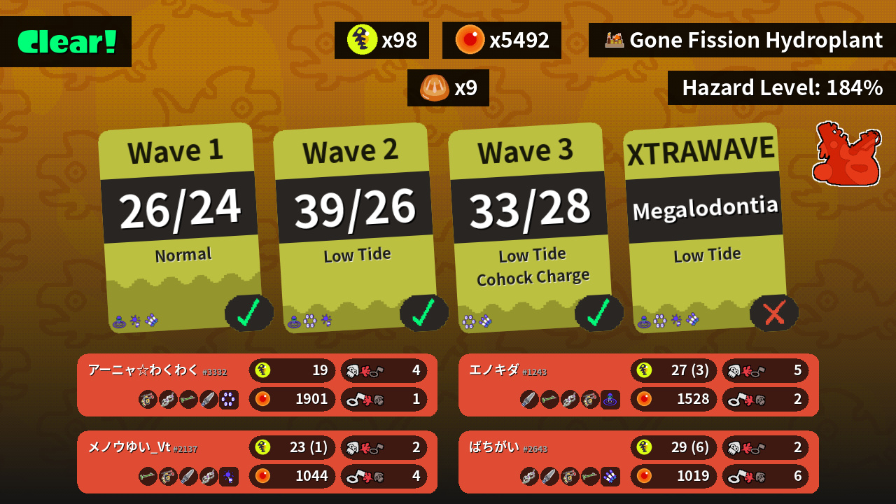 | Weapons | Douser Dualies FF Dark Tetra Dualies Bamboozler 14 Mk I Splatana Stamper | Dark Tetra Dualies Splatana Stamper Douser Dualies FF Bamboozler 14 Mk I | Splatana Stamper Bamboozler 14 Mk I Dark Tetra Dualies Douser Dualies FF | Bamboozler 14 Mk I Douser Dualies FF Splatana Stamper Dark Tetra Dualies |