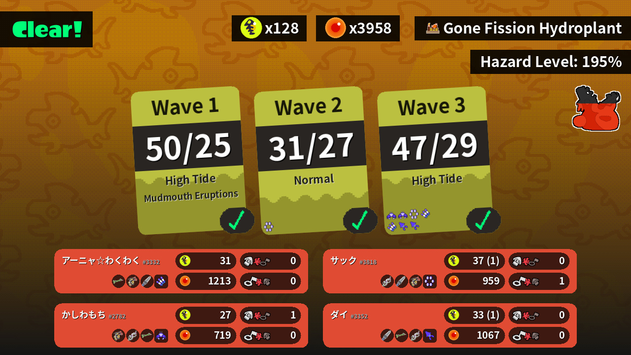 | Weapons | Bamboozler 14 Mk I Douser Dualies FF Splatana Stamper | Dark Tetra Dualies Splatana Stamper Douser Dualies FF | Splatana Stamper Bamboozler 14 Mk I Dark Tetra Dualies | Douser Dualies FF Dark Tetra Dualies Bamboozler 14 Mk I |