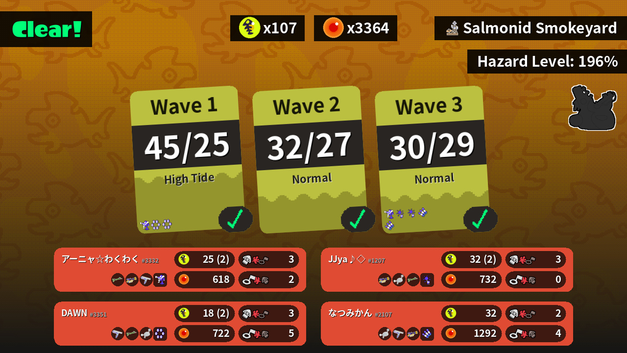 | Weapons | Bamboozler 14 Mk I Mini Splatling Big Swig Roller | Luna Blaster Big Swig Roller Mini Splatling | Mini Splatling Luna Blaster Bamboozler 14 Mk I | Big Swig Roller Bamboozler 14 Mk I Luna Blaster |