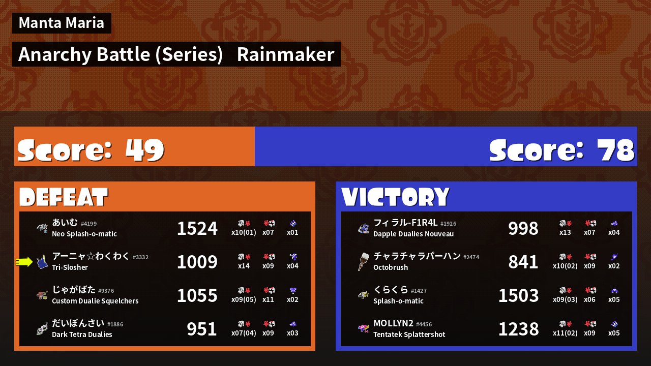 | Medals | #1 Overall Splatter #1 Enemy Splatter #1 Rainmaker Stopper | ||