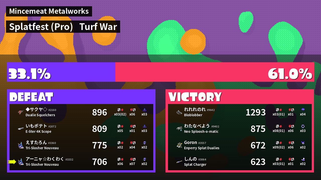 | Medals | #1 Overall Splatter #1 Popular Target #1 Enemy-Base Inker | ||