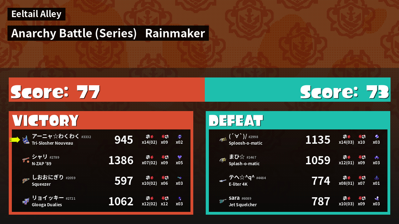 | Medals | #1 Overall Splatter #1 Enemy Splatter #1 Splat Assister | ||