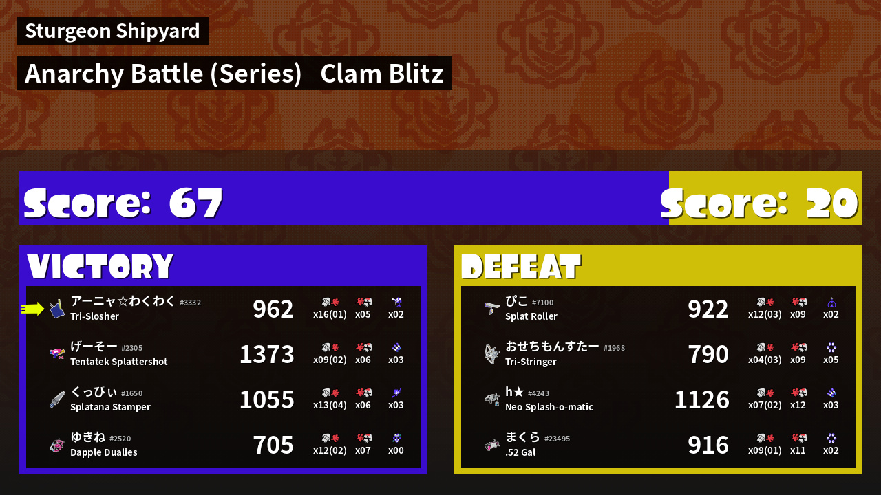 | Medals | #1 Overall Splatter #1 Clam Carrier #1 Super Jump Spot | ||